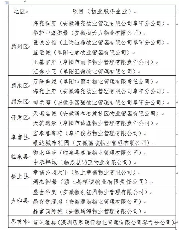 为进一步深化大美阜阳建设,根据《关于开展物业管理优秀住宅小区(示范小区)创建活动的通知》(阜房办〔2017〕31号)精神,市房产局联合市房协成立了阜阳市物业管理示范小区考核小组,对各地39个住宅小区进行了评定。经现场考评和综合评审,决定命名以下21个项目为2017年度阜阳市示范小区。